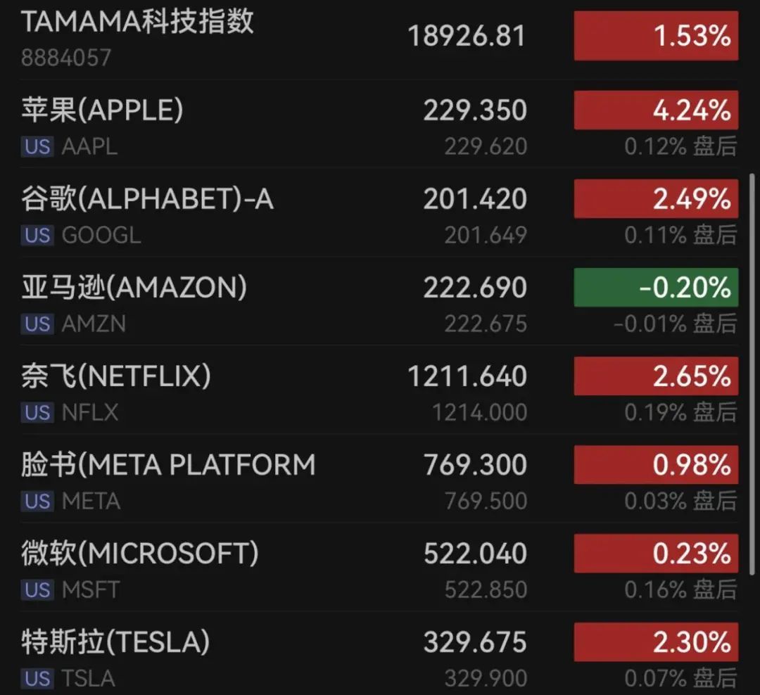 大型科技股普遍上涨,苹果涨超4%,谷歌涨逾2%,特斯拉涨超2%,英伟达涨逾1%,脸书涨近1%,微软涨0.23%,亚马逊跌0.2%。