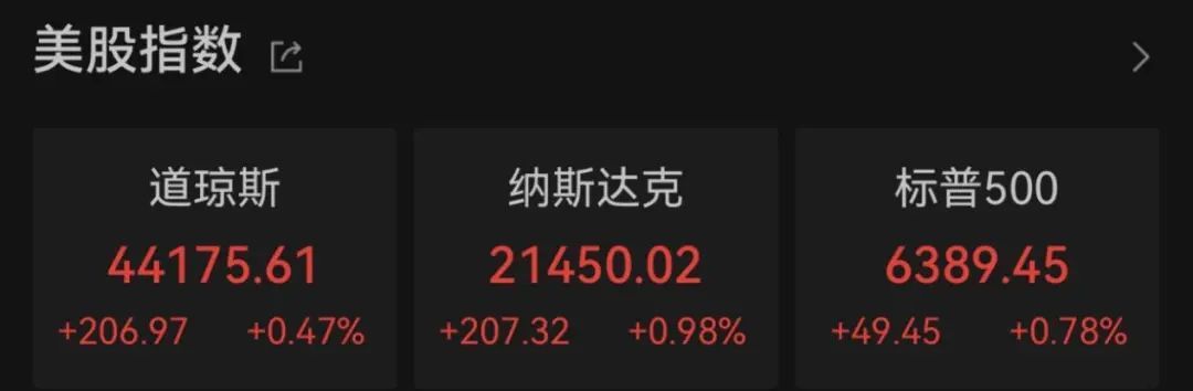 截至收盘,道指涨0.47%,报44175.61点,标普500指数涨0.78%,报6389.45点,纳指涨0.98%,报21450.02点,创历史新高。