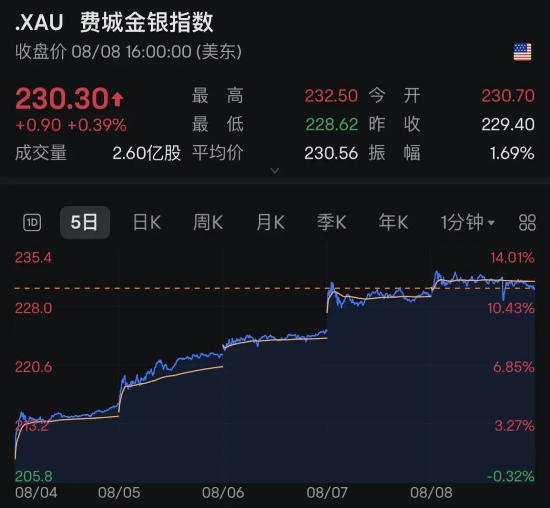 费城金银指数收涨0.39%,报230.30点,本周累涨11.53%。